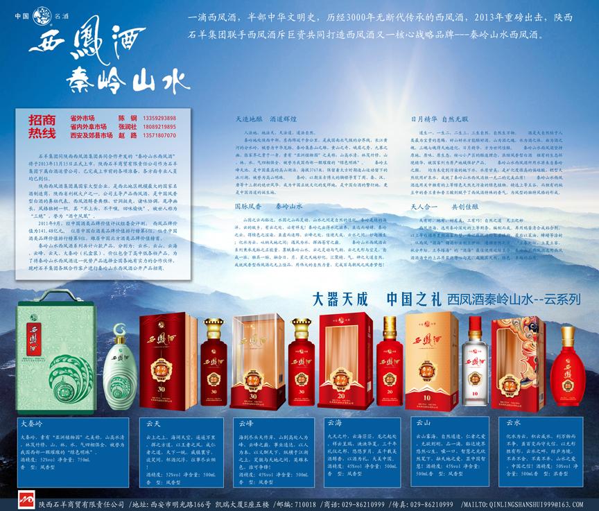 秦嶺山水西鳳酒系列共計六款產品,分別為:云水、云山、云海、云峰、云天、大秦嶺(禮盒裝),價位包含了高中低各檔產品。為了將秦嶺山水西鳳酒這一優勢產品選擇全國各地有實力的合作伙伴,現對石羊集團各級合作客戶進行秦嶺山水西鳳酒公開產品招商,各地有合作意向客戶可聯系石羊商貿公司以下相關人員。
