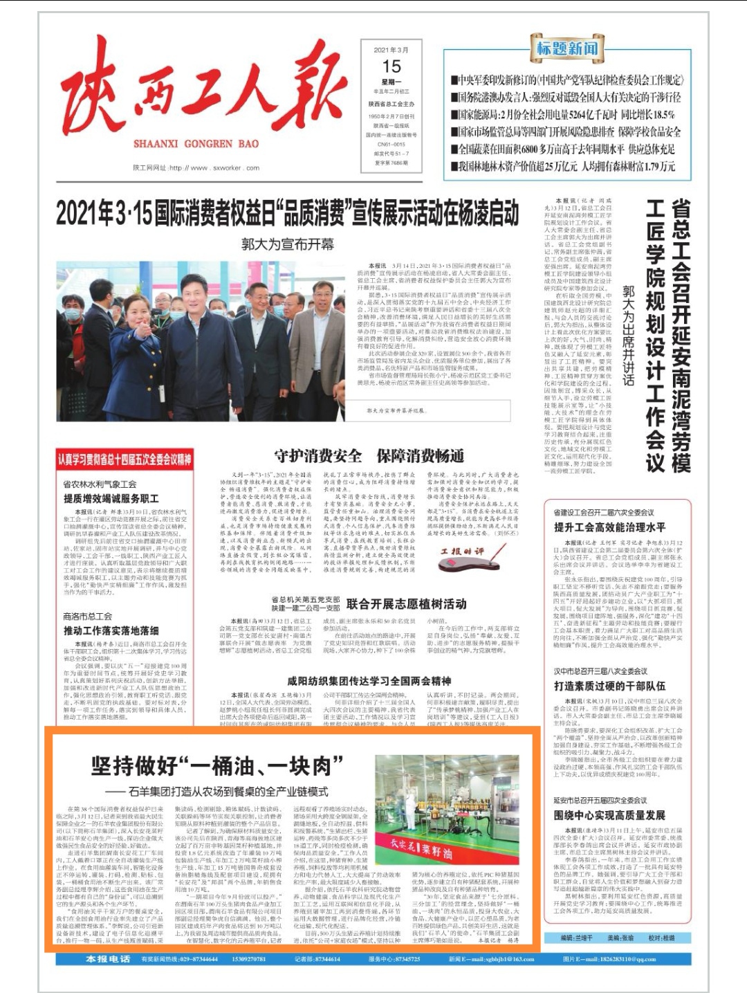 第39個(gè)國際消費(fèi)者權(quán)益保護(hù)日前夕,陜西日?qǐng)?bào)、西部網(wǎng)、陜西網(wǎng)、華商報(bào)、三秦都市報(bào)、西安日?qǐng)?bào)、陜西工人報(bào)、勞動(dòng)者報(bào)等主流媒體采訪團(tuán)走進(jìn)石羊集團(tuán)參觀,了解企業(yè)踐行2021年消費(fèi)維權(quán)年主題“守護(hù)安全 暢通消費(fèi)”舉措。
